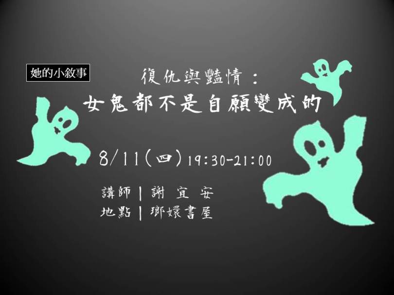 無論是在古早或當代的故事中,若有鬼出現,幾乎都是女鬼——彷彿女鬼無所不在。而且故事中的女鬼們,往往靈力強大,足以使人心生畏懼。為什麼女鬼這麼多呢?彷彿比起男人,女人更容易成為鬼?……假使了解女鬼的成因,可以說,確實是這樣沒錯。但是,即便女鬼們身世淒慘,故事也不見得能為她們平反。本次從女鬼的復仇與豔情兩個面向,介紹那些身不由己的女鬼們。